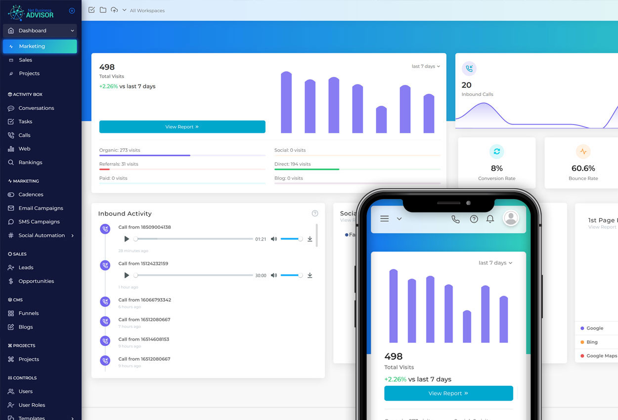 We built this software not only to market our clients, but also to provide them with the tools they need to manage their leads, automate lead follow-up, report on marketing and sales activity, manage their website, and engage in projects we perform with their business. Serving the Laguna Beach, CA area. We are now offering the following features without needing one of our marketing plans.